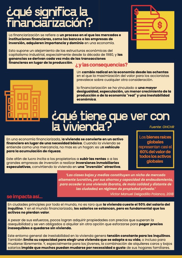 Un proceso y sistema económico que convierte necesidades, como la vivienda, en un vehículo para acumular capital –es decir, la acumulación de capital o dinero con actividades productivas poseen menor importancia económica que la acumulación basada en inversiones.
